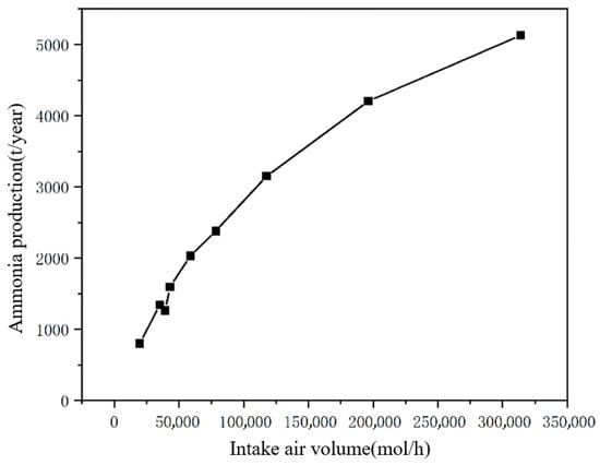 Assuming that the reactor produces 24 h a day without interruption and 300 days a year, the annual production of ammonia at this inlet volume can be calculated as below based on the inlet volume and the corresponding ammonia conversion rate.