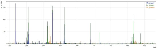 Overlaid positive ion 109AgLGN LDI MS spectra of Mn(II), Co(II), and Zn(II) complexes with chrysin in the m/z range 200–600.