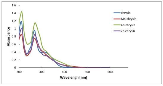 Electronic absorption spectra of Mn(II), Co(II), and Zn(II) complexes with chrysin in methanol. The solutions of Mn(II) and Zn(II) complexes were saturated, while the concentrations of chrysin and Co(II) complex were 0.01 mg/mL.