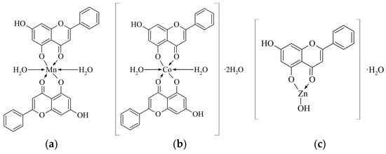 Proposed structures of the metal complexes with chrysin: (a) Mn-chrysin, (b) Co-chrysin, and (c) Zn-chrysin.