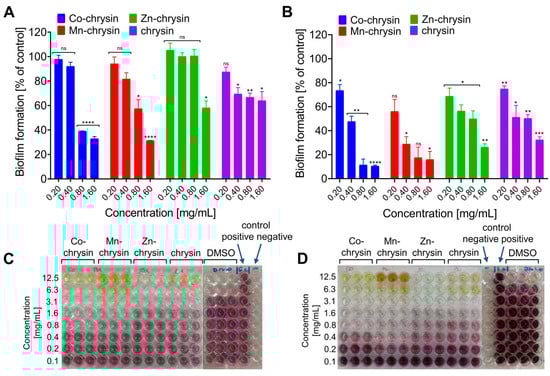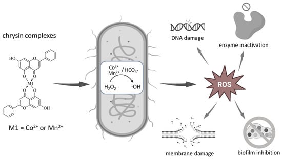 Despite these promising findings, the antimicrobial and especially antibiofilm properties of chrysin–metal complexes remain insufficiently explored, and to date, no comprehensive studies addressing this issue have been published. This gap in knowledge highlights the need for further research aimed at evaluating such biological activities.