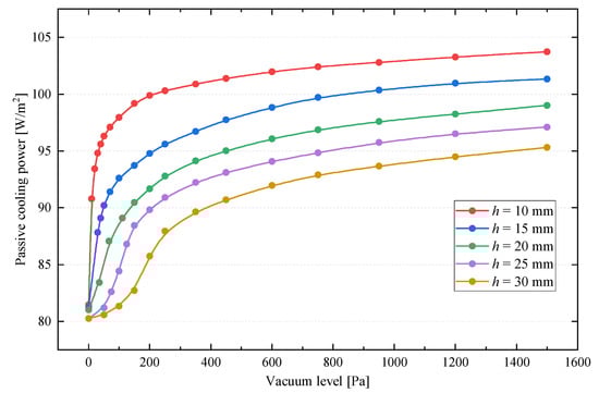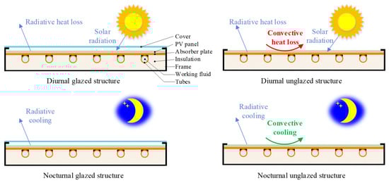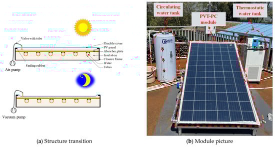 However, the PVT module faces significant structural compatibility challenges between its diurnal and nocturnal modes [27,28]. As shown in Figure 1, while the diurnal mode requires a glazed structure to minimize convective heat losses, the cover simultaneously impedes thermal exchange between the PV panel and the ambient atmosphere at night [29]. Additionally, the nocturnal cooling performance of the module depends on the spectral characteristics of both the cover and the emitting surface. In contrast, the nocturnal mode benefits from an uncovered structure, which reduces thermal resistance to the ambient atmosphere and enhances heat dissipation during the passive cooling process. However, this configuration significantly limits thermal energy gain during the day. Specifically, a covered module can produce up to 26% more energy during the day compared with an uncovered one [30], while an uncovered module can harness an additional 10 to 20% cooling energy at night through convective heat exchange [31]. In our previous studies [25,32], a compact photovoltaic–thermal–passive cooling (PVT-PC) module incorporating a switchable ethylene tetrafluoroethylene (ETFE) film insulation was proposed, and the performance was measured experimentally. This design enables transitions between glazed and unglazed structures by inflating or deflating the air cushion. However, the module’s performance is highly sensitive to the structural height of the air cushion and internal vacuum level. For example, increased structural height or reduced vacuum can decrease the contact area between the cover and the PV surface, thereby elevating thermal resistance and impairing nocturnal passive cooling power. Conversely, a taller structural height may improve diurnal thermal insulation, enhancing thermal energy collection. Moreover, cooling energy acquisition under varying meteorological conditions remains insufficiently understood. Therefore, a comprehensive investigation of these coupled effects is essential for optimizing the all-day performance of the PVT-PC module.