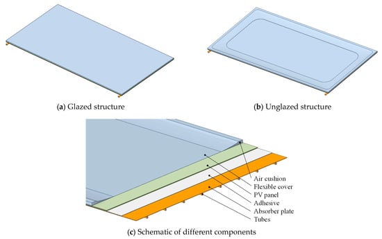 A schematic of the proposed module, along with a picture of it, is displayed in Figure 2. The physical model of the PVT-PC module is shown in Figure 3c, while the corresponding geometry and material properties of the module and PV panel are detailed in Table 1 and Table 2, respectively. The model comprises a flexible cover, an air cushion, a PV panel, an absorber plate, a tube, and a working fluid (water). The PV panel and the absorber plate are bonded together by an adhesive layer. The structural intricacies of the PV panel are neglected, and it is an idealized isotropic model. Its average thermophysical properties are calculated based on the weighted contributions of its constituent materials [37]. Instead of conventional glass, an ETFE film is used as the flexible cover. Once sealed with silicone, it forms an inflatable air cushion between the film and the PV panel. By inflating or deflating this air cushion, the module transitions between a glazed and unglazed structure, corresponding to diurnal and nocturnal modes, respectively. The operating principles of the module during daytime and nighttime are as follows: