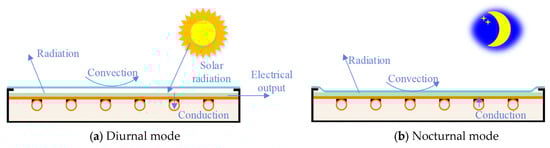 The heat transfer mechanisms of the proposed module during the diurnal and nocturnal modes are shown in Figure 4. In the diurnal mode, the PV cell converts part of the solar radiation transmitted through the flexible cover into electricity, while the leftovers are conducted into the working fluid. Simultaneously, the PV cell dissipates thermal energy to the environment through thermal radiation and convection. In the nocturnal mode, heat is gradually conducted from the working fluid to the PV panel, which then dissipates to the sky and the ambient atmosphere through thermal radiation and convection.
