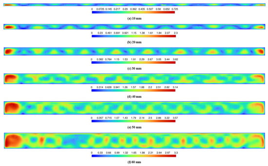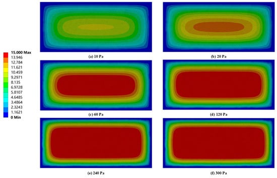 Figure 5 shows the deformation of the flexible cover under varying vacuum levels, with the structural height set at 15 mm. When the vacuum level is relatively low, the deformation of the flexible cover remains minimal. For instance, at a vacuum level of 20 Pa, the maximum deformation is only 13.1 mm. However, as the vacuum level increases, the flexible cover begins to conform the PV panel, forming an adhesion region with a rounded rectangular shape. When the deformation reaches its maximum value, which corresponds to the structural height of the air cushion, the flexible cover is in full contact with the surface of the PV panel, leaving no air gap between them in that region. As the vacuum level rises from 10 Pa to 300 Pa, the adhesion ratio between the cover and the PV panel increases progressively from 32.47% to 52.67%. The adhesion ratio is defined as the ratio of the area corresponding to the maximum deformation of the flexible cover to its total area.