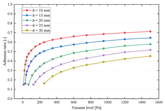 The effect of the structural height and vacuum level on the adhesion ratio.