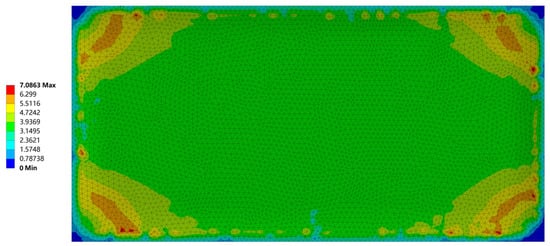 The Von Mises criterion reflects the distortion energy within a material subjected to complex stress states. Compared with the maximum shear stress (Tresca) criterion, the Von Mises criterion shows better agreement with experimental data under multiaxial stress conditions. Figure 7 illustrates the distribution of Von Mises equivalent stress at a vacuum level of 1500 Pa and a structural height of 15 mm. The equivalent stress in the flexible cover exhibits clear symmetry, with the lowest value of only 0.79 MPa occurring at the four corners. Stress levels are moderately elevated in the central adhesion region, while significant stress concentrations appear at the edges of the adhesion region. This is attributed to greater localized deformation in these regions, which, in turn, subjects the material to higher tensile forces. In regions of stress concentration, when stress approaches the material’s yield strength, localized plastic deformation or even structural failure may occur earlier than in other areas. From a structural safety perspective, the maximum stress observed at the corners of the adhesion region is the critical factor in determining the mechanical reliability of the flexible cover. Yin et al. [48] proposed a safety evaluation indicator for ETFE materials, where the safety factor is defined as the ratio of the material’s yield strength to the maximum stress of the flexible cover: