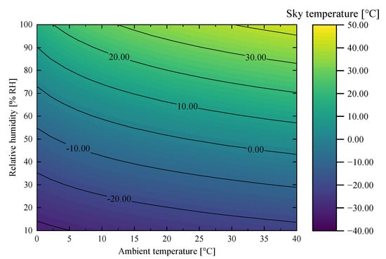 The effective sky emissivity increases with rising atmospheric water vapor content [43] and is calculated as follows [38]: