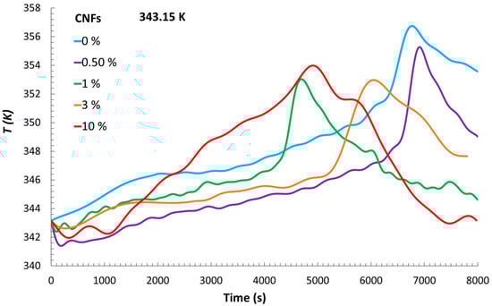 The temperature evolution of the suspension in which polymerization occurred for each experiment is shown in Figure 1, while the corresponding results for the ethylene glycol bath are presented in Figure 2. It can be observed that the reaction with the earliest temperature increase was the one containing the highest number of CNFs tested.