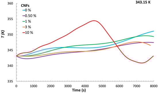 Evolution of the temperature in the ethylene glycol bath used in the polymerization with the indicated amounts of CNFs added relative to the monomer mass.