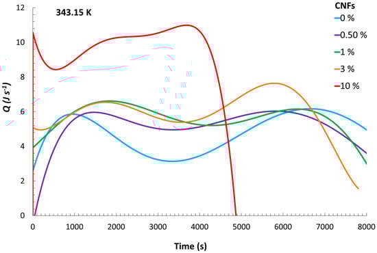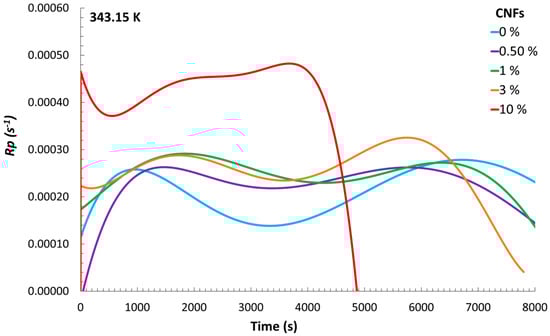 The heat flows corresponding to the reaction in each of the experiments are shown in Figure 3, from which a trend can be observed. Although the experiments with 0.5% CNFs and no CNFs exhibited similar heat flows, it can be seen that, with a higher content of CNFs, the maximum released heat flow increased. Consequently, the Rp values showed a similar trend (Figure 4).