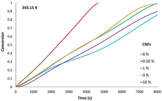 The monomer-to-polymer conversion evolution curves (presented in Figure 5) were obtained by integrating the Rp curves shown in Figure 4. These curves showed the same trends as those observed in the previous ones: although curves associated with similar amounts of nanocellulose tended to overlap, it can be noted that, as the reactions progressed, a higher amount of CNFs led to a faster monomer-to-polymer conversion.