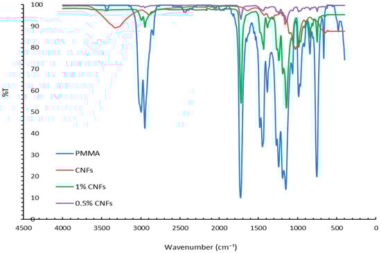 The FTIR spectra for pure CNFs, pure PMMA, and PMMA/CNFs are presented in Figure 6.