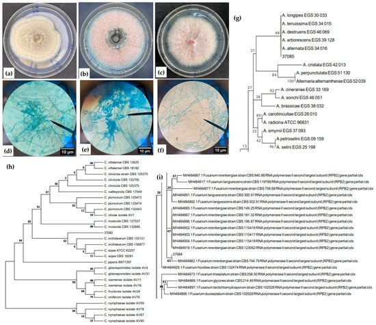 Macroscopic and microscopic structures (hyphae and spores) and phylogenetic clades of phytopathogenic fungi isolated from the roots of hydroponically grown lettuce: (a,d,g) Alternaria sp. 37085; (b,e,h) Colletotrichum orchidearum 37083; and (c,f,i) Fusarium nirenbergiae 37084.
