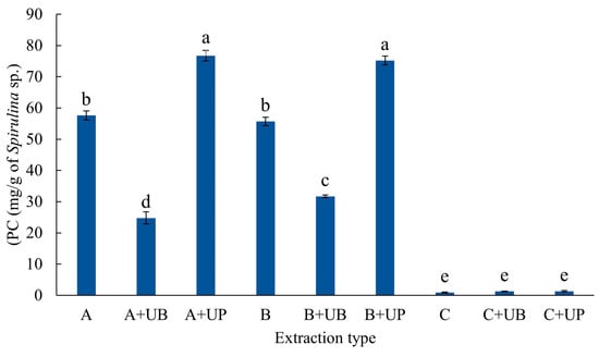 The PC extraction is presented in Figure 2. The A+UP and B+UP methods resulted in the highest extraction yields (76 mg of PC extracted per gram of S. platensis), with no significant difference between them. Hydroalcoholic mixture-based methods (C, C+UB, and C+UP) led to significantly lower PC extraction yields from S. platensis biomass.