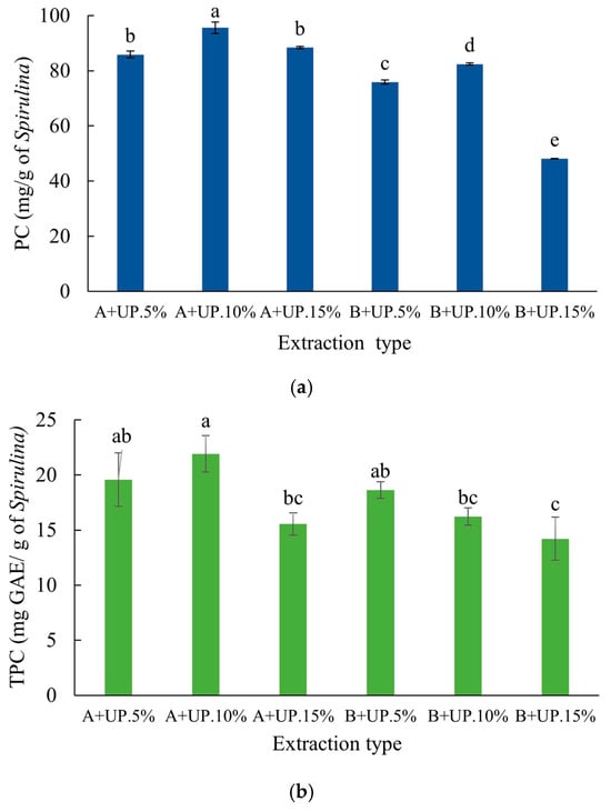 Phycocyanin (PC) and total phenolic content (TPC) of sonicated Spirulina platensis extracts at different concentrations (5, 10, and 15% w/v): (a) phycocyanin (PC); and (b) total phenolic content (TPC). Treatment A+UP corresponds to biomass homogenized in phosphate buffer for 21 h at 4 °C, and treatment B+UP corresponds to biomass homogenized in phosphate buffer for 4 h at 25 °C. All extracts were subjected to ultrasound probe treatment after the extraction period in buffer solution. Extracts were formulated at concentrations of 5, 10, and 15% (w/v). Data are expressed as means ± standard deviation (n = 3). Different letters indicate significant differences between treatments according to Tukey’s test (p < 0.05).