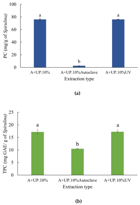 The non-sterilized extract (A+UP.10%) and the extract exposed to UV light for one hour (A+UP.10%UV) both showed 76 mg of PC·g−1 of S. platensis, with no significant difference between them (Figure 5a). However, the extract subjected to autoclaving (A+UP.10%Autoclave) showed a significant reduction in PC concentration, resulting in 2.62 mg PC·g−1 of S. platensis. Regarding TPC content, both extracts A+UP.10% and A+UP.10%UV exhibited statistically sim ilar values (17.25 mg GAE.g S. platensis−1) (Figure 5b). In contrast, the autoclaved extract showed a significant reduction in TPC content, reaching 10.49 mg GAE·(g of S. platensis)−1.