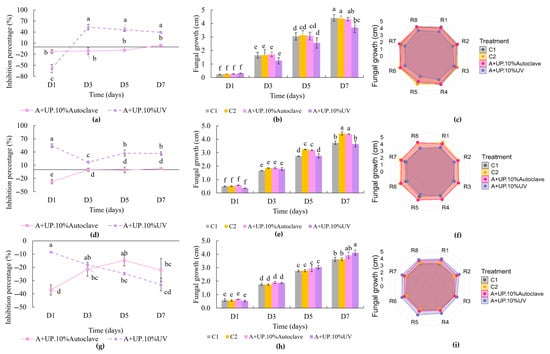 Figure 6g–i shows the inhibition levels of the extracts against the phytopathogen Alternaria sp. The treatments resulted in fungal growth promotion, which is the opposite effect compared to the other phytopathogens studied. The lowest inhibition percentages were observed with the A+UP.10%Autoclave extract on the first day (−37.02%), while the A+UP.10%UV extract resulted in −32.96% inhibition. The ineffectiveness of the extracts against Alternaria sp. is also evident in Figure 6h, where mycelial growth was higher in the treatments compared to the controls on the seventh day of the experiment. This can also be visually observed in the radial representation (Figure 6i). These results suggest a potential fungal growth-promoting effect of the extracts against Alternaria sp.