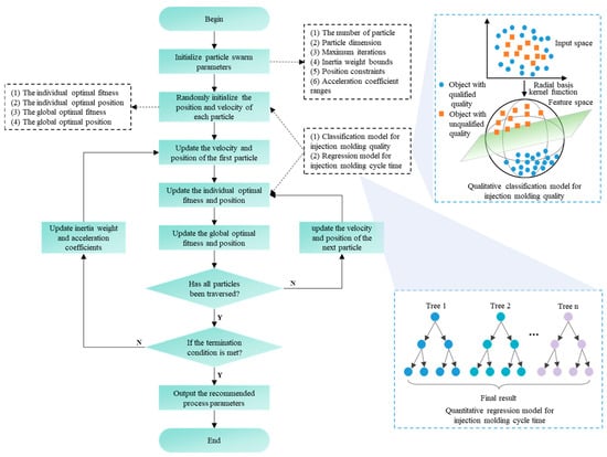 In this paper, an improved particle swarm optimization (IPSO) algorithm integrating dynamic inertia weight adjustment, and adaptive variation in acceleration coefficients was proposed to enhance global search capabilities while avoiding local optima in this paper. In addition, quality constraints have been incorporated to ensure that compliance with product qualification standards is maintained at every positional iteration. This integration ensures that predefined product quality requirements are strictly adhered to by each particle’s positional update throughout the optimization process. A qualitative analysis model based on support vector machine (SVM) is established to ensure the conformity of product quality, while a quantitative analysis model utilizing extreme gradient boosting (XGBoost) is constructed to calculate the injection molding cycle time as the fitness value.
