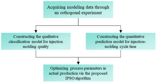 As depicted in Figure 3, the overall experimental procedure of this study is structured into three sequential stages: (1) orthogonal experimentation to acquire the dataset required for subsequent modeling; (2) development of a qualitative classification model for injection molding quality to impose constraints on both particle initialization and iterative optimization, and construction of a quantitative prediction model for injection molding cycle time to serve as the fitness function; and (3) on-site implementation of the proposed IPSO algorithm for the optimization of injection molding process parameters, thereby validating its practical efficacy.