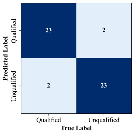 The qualitative classification model for product quality was evaluated using a confusion matrix to analyze its performance in distinguishing between qualified and unqualified products. The confusion matrix obtained from the test dataset is presented as described in Figure 4. As delineated in Table 1, the model’s accuracy, precision, recall, and F1 score all attain a value of 0.92, as computed from the confusion matrix. These results suggest that the proposed model effectively captures the critical features influencing product quality in injection molding.