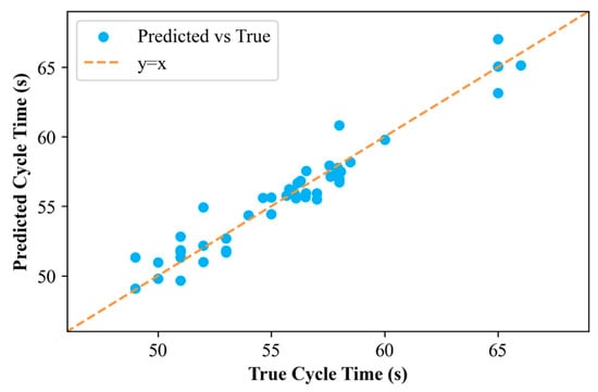As listed in Table 2, the model achieved an R2 value of 0.93, indicating that 93% of the variance in cycle time can be explained by the selected process parameters and their interactions. This high R2 value demonstrates the model’s strong alignment with the experimental data and its effectiveness in capturing the nonlinear relationships inherent in the injection molding process. The RMSE, a measure of prediction accuracy, was calculated as 1.05, reflecting the average deviation between the predicted and actual cycle times. This low error value suggests that the model provides precise and reliable estimates, which are critical for real-time process optimization. A visual comparison of predicted versus actual cycle time values, as illustrated in Figure 5, further corroborates the model’s performance. The data points are closely distributed along the diagonal line (y = x), with minimal outliers, indicating a high degree of consistency between predictions and experimental observations.