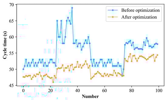 The IPSO algorithm was empirically validated within the context of actual injection molding production processes. Operators were required to input the injection molding machine identification number, mold number, ambient temperature, and ambient humidity. Upon receiving this information, the program would generate a recommendation for the optimal combination of process parameters. The testing procedure was as follows: at the commencement of each production batch, the operator initially adjusted the process parameters based on their experience. Once stable and qualified product production was achieved, the current injection molding cycle time was recorded. Subsequently, the parameters were adjusted to the optimal combination recommended by the algorithm, and injection molding was performed again. The qualification of the product and the current injection molding cycle time were then documented. For each injection molding machine used in the modeling process, 20 experiments were conducted, yielding a total of 100 pieces of data. The mean fitness values for 50 independent runs for the IPSO and the standard PSO algorithms corresponding to the first data are presented in Figure 6. It is evident that the fitness value variation in the IPSO algorithm is more stable and gradual, with a significantly lower fitness value achieved upon completion of the iterations. In contrast, the standard PSO algorithm is observed to prematurely converge near a local optimum. Consistent trends are also observed in the other data. These results suggest that the IPSO algorithm demonstrates enhanced stability and global search capability during the optimization process, thereby enabling more effective identification of solutions that approach the global optimum. The product quality obtained based on the process parameters recommended by the algorithm is all qualified. Moreover, the comparison of injection molding cycle times for the 100 experiments is depicted in Figure 7. The blue and orange points in the figure correspond to the injection molding cycle times obtained using the process parameters before and after optimization by the proposed algorithm, respectively. It is evident that the optimization of process parameters via the proposed algorithm yields a significant improvement in injection molding cycle time. Calculations indicate an average reduction of 9.41% relative to the performance of operator-defined parameters, decreasing the mean cycle time from 55.30 s to 50.09 s. A paired t-test confirmed the statistical significance of this reduction (t (99) = 15.6539, p < 0.0001). Notably, the algorithm-optimized parameters substantially reduced process variability (SD = 2.39) compared to operator-defined parameters (SD = 4.23). The mean reduction of 5.20 s (95% CI [4.54, 5.86]) was further supported by an exceptionally low p-value (p ≈ 1.0 × 10−6 at α = 0.05) and a large t-statistic, underscoring the robustness of the improvement. In addition, statistical analysis via the two-sided Wilcoxon rank-sum test revealed a significant difference in cycle time distributions between the operator-defined and IPSO-optimized parameter sets (p < 0.0001, α = 0.05). Consequently, the null hypothesis asserting equal distributions is rejected, indicating that the IPSO algorithm yields a statistically significant reduction in injection molding cycle times relative to manual parameter adjustment.