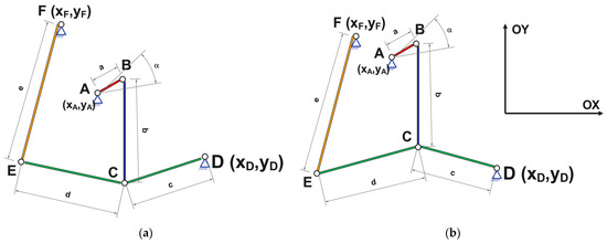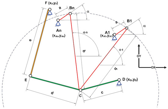 - Both the coordinates of fixed joints A, D, and F, as well as the dimensional values of the mechanism’s elements (a, b, c, d and e), will be substituted into calculation Equations (1)–(10).
