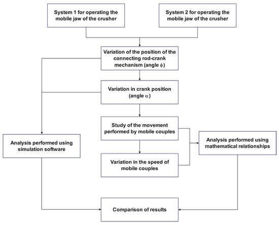 However, many studies are limited to static analysis or global parameters, without accounting for dynamic variations in motion relative to the angular position of the system components [49,51,74,75,76]. Furthermore, few investigations offer a comparative perspective on the two drive types with respect to the variation in linear velocity of the moving links—an important gap considering their impact on mechanical performance, component wear, and energy consumption. This justifies a detailed theoretical study aimed at comparing both design configurations using modern simulation and mathematical modeling methods. Such research can provide valuable insights for designers, engineers, and operators, contributing to improved equipment performance and reduced operational costs. Therefore, the aim of this study is to conduct a comparative theoretical analysis of the two drive systems, pull-type and push-type, used in double-toggle jaw crushers, in order to identify the optimal configuration in terms of linear velocity, kinematic stability, and functional efficiency. To achieve this objective, the study applies a combination of mathematical modeling, numerical simulation, and graphical analysis to a real constructive model (SMD-117) [49], highlighting behavioral differences between the two systems and offering concrete recommendations for the optimal design and operation of jaw crushers.