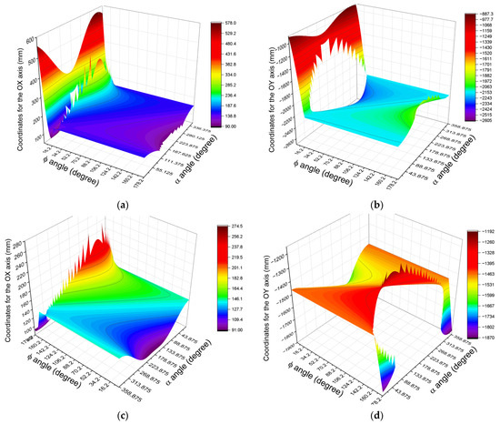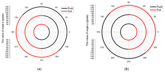 Considering the aspects presented earlier, it was decided that the angle ϕ should vary within the range of 40° to 130° (an angle to be adopted for both drive systems), with a step size of 0.5°. This results in a total of 181 angle positions.