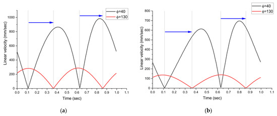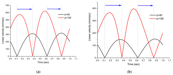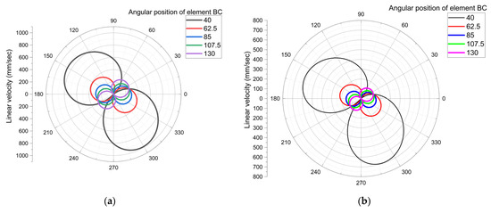 Variation in the linear velocity for the extreme positions of angle ϕ in the drive system presented in Figure 1b: (a) for joint C; (b) for joint E.