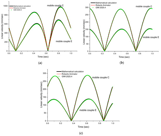 Since a laboratory test bench could not be developed for this study to experimentally verify the theoretically obtained values, specialized software tools were utilized instead. As illustrated in Figure 3, the results obtained from both determination methods were compared for the purpose of validating the mathematical relationships applied. To simulate the motion executed by the drive system of the double-toggle jaw crusher, the following software packages were employed, each tailored for analyzing different types of mechanisms: (1) Roberts Animator v. 2.1.0 [77], part of the WATT Mechanism Suite developed by Heron Technologies, is used for planar mechanism analysis and animation; (2) GIM v. 2025.4 [78,79], an educational tool developed by the COMPMECH Research Group at the University of the Basque Country (UPV/EHU), supports the analysis and synthesis of planar mechanisms.