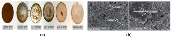 (a) Lithium dendrite growth phenomenon when overcharging occurs in different SOC; (b) SEM images of the cathodes overcharged to 1.00SOC and 1.85SOC [65].