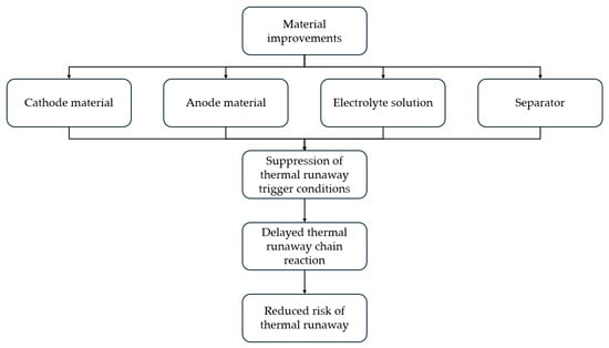 Material improvement plays a crucial role in the thermal management and prevention of thermal runaway in LIBs [118]. The relationship between material improvement and prevention of thermal runaway of Li-ion batteries is shown in Figure 8. Enhancing the thermal conductivity and thermal capacity of materials can effectively reduce heat accumulation, thereby minimizing the risk of thermal runaway. Additionally, the use of highly efficient thermal isolation and regulation materials improves heat dissipation and equalizes internal temperatures, preventing localized overheating. Furthermore, functionalized materials, such as phase change materials and thermally conductive polymers, can buffer temperature fluctuations, further improving thermal management. Therefore, material enhancement is essential for ensuring the safety and performance of LIBs.