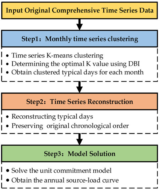 While full-year hourly simulations provide higher accuracy, they also introduce significant computational challenges due to long-term temporal coupling constraints. To address these problems, researchers have explored various simplification techniques for time series modeling in systems with high renewable penetration. These techniques generally fall into two categories. (1) The multi-timescale grid method [3,4]: The multi-timescale grid method models different types of devices in power systems based on temporal grids corresponding to various timescales. Ref. [5] applies the multi-timescale grid method to analyze the charging and discharging behavior of long-term and short-term energy storage systems. Ref. [6] proposes a unified hierarchical multi-timescale grid method for the optimal allocation of flexibility resources in power systems. (2) Time series clustering method [7,8]: Ref. [9] used time series aggregation to replace a full hourly or even sub-hourly PSOM (Power System Optimization Model) with a smaller model using a simplified time dimension. Ref. [10] proposed a short-term load forecasting method that combines K-shape time series clustering with graph convolutional networks, identifying user groups with similar electricity usage habits. Ref. [11] employed the Dynamic Time Warping (DTW) method to conduct a cluster analysis of the time series of renewable energy in 130 countries in order to evaluate the similarities and differences in their usage patterns.