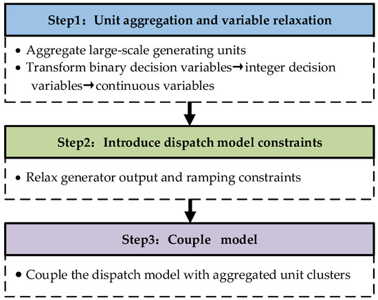 In the spatial dimension, the large number of binary variables associated with thermal generators significantly increases the computational burden, especially in year-long sequential simulations. To reduce this complexity, various methods have been proposed, including binary variable relaxation [14,15] and rolling horizon techniques [16,17]. Some studies incorporate flexible temporal resolution or operational flexibility to simplify the problem structure, reducing the MILP to a linear program [18,19]. Others focus on unit clustering, aggregating similar generators to lower the model dimensionality [20,21]. While these spatial simplifications improve computation time, they often compromise accuracy, especially when system security and stability constraints are considered.