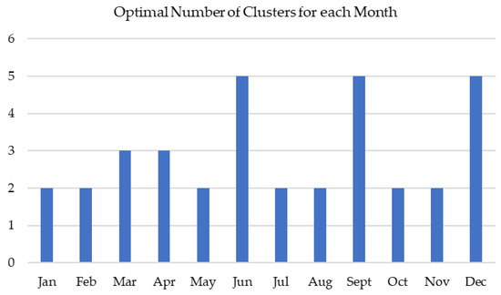 Figure 4 presents the optimal clustering results for each month as determined by the proposed approach. The number of representative days differs across months, with June, September, and December showing relatively higher values (5 days), indicating greater variability and randomness in the time series during those periods.