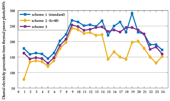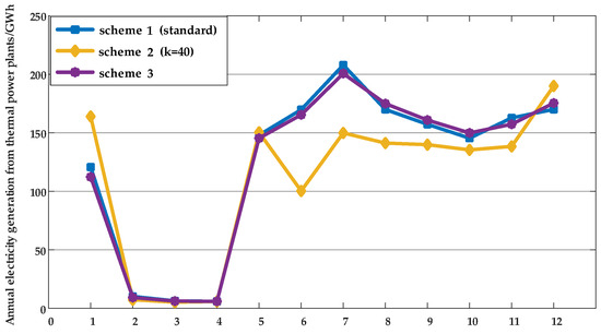 Figure 5 illustrates the thermal power output profiles under the three schemes for a typical day. Figure 6 shows the monthly thermal generation across the year. In Figure 5, Scheme 2 significantly underestimates thermal generation during several hours. This output deviation is mainly due to its failure to capture the synchronous peaks in load and dips in renewable output—especially when high demand coincides with low renewable availability. In contrast, Scheme 3 closely tracks the hourly profile of Scheme 1, indicating that it successfully retains key temporal dynamics despite data reduction. Figure 6 further confirms this over the annual scale. Scheme 2 underestimates thermal generation in several months, most notably in July and August, where system reliability heavily depends on thermal support due to high load and volatile renewable output. Scheme 3, however, remains highly consistent with Scheme 1 across all months, demonstrating its ability to accurately capture the interaction between load and renewable variability.