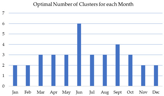After applying monthly clustering to the time series within the RTS79 system, the results, as illustrated in the corresponding Figure 8, show that June exhibits the highest daily variability, with up to six representative days.