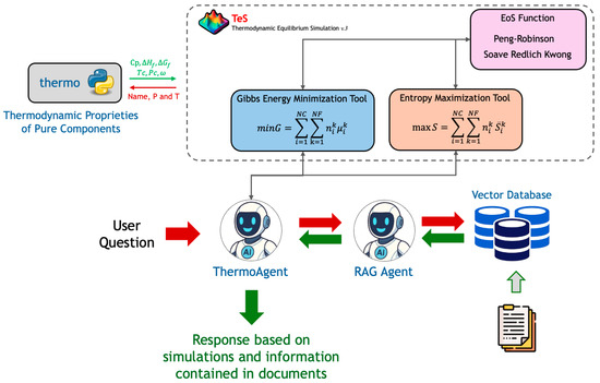 The previous sections provided information about the modeling employed to solve equilibrium problems. At the programming language level, each methodology, minG and maxS, is implemented as Python modules and can be invoked through simple function calls. The next step in this study is to develop an AI agent capable of consuming these previously described modules to perform thermodynamic equilibrium calculations. Figure 1 presents the proposed architecture for the AI agent, called ThermoAgent, which can execute simulations and retrieve information from documents previously specified by the user to enrich the context.