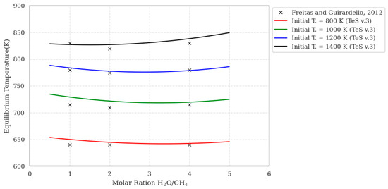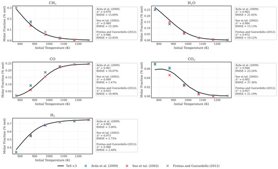 To validate the results reported by TeS v.3, both simulated and experimental data from previous studies on the SMR process are used. As an initial verification, Figure 2 presents the results generated by TeS v.3 alongside simulated data reported by Freitas and Guirardello [53], Ávila et al. [54], and Seo et al. [55].