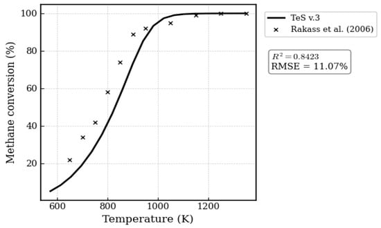 More important than validating simulated data against simulations reported by other authors is the validation of simulated data against experimental data, which is essential. Figure 3 presents a comparison between the simulated data obtained using TeS v.3 and the experimental data reported by Rakass et al. [56]. The experiments conducted by Rakass et al. [56] were carried out at 1 atm, with a H2O/CH4 molar ratio of 2:1 and temperatures ranging from 300 to 800 °C. The authors employed unsupported nickel powder as the catalyst.