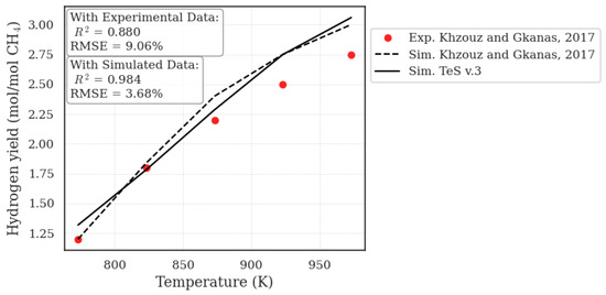 In addition to the experimental data, Khzouz and Gkanas [57] also reported simulated results by applying the Gibbs energy minimization approach under the same conditions as those used in their experiments. As verified in Figure 4, the results obtained with TeS v.3 demonstrate a high degree of accuracy and predictive capability. The simulator’s outputs show excellent agreement with the simulated thermodynamic equilibrium data from Khzouz and Gkanas [57], achieving a coefficient of determination of over 0.98. This near-perfect correlation primarily validates the fundamental thermodynamic engine of TeS v.3, confirming its ability to accurately replicate established equilibrium models.