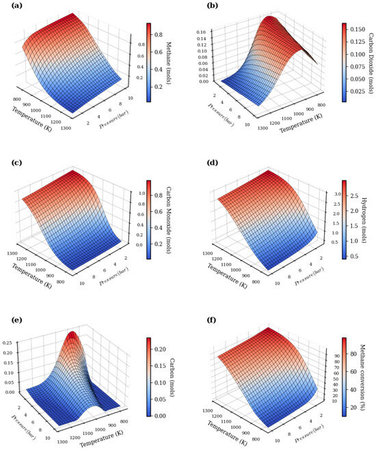 The results presented in this section were generated using TeS v.3, employing the Peng–Robinson EoS to account for non-ideal behavior and allowing for the formation of components in both phases using minG. The SMR process was investigated over a temperature range of 773–1273 K, pressures from 1 to 10 bar, and methane feed compositions ranging from 0.5 to 3.0 mol, while the amount of steam in the feed was fixed at 1 mol. A total of 8000 simulations were performed in approximately 3 min.