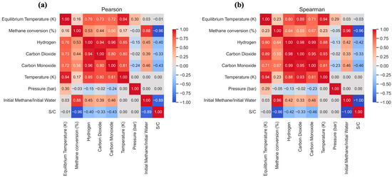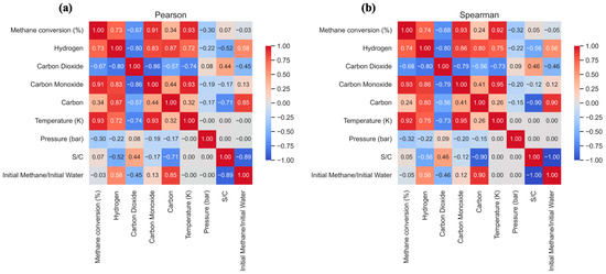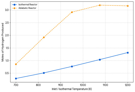 The SMR process analysis revealed distinct and fundamental behaviors for both isothermal and adiabatic reactors. For isothermal reactors, the results confirmed that high temperatures and low pressures maximize hydrogen production, while solid carbon formation exhibits a complex behavior with a peak at intermediate temperatures (around 900 K). In contrast, the analysis of adiabatic reactors demonstrated the self-limiting nature of the process, where the significant temperature drop caused by the endothermic reaction severely limits methane conversion, even under high inlet temperatures. This limitation was quantitatively confirmed by the weak correlation (+0.17) between the initial temperature and conversion.