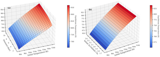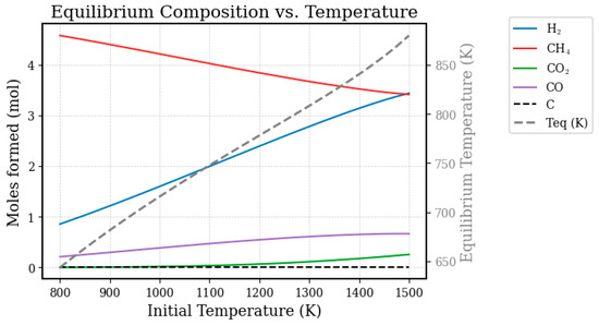 The previous sections provided details on the approach used for equilibrium calculations as well as the assumptions adopted. This section aims to present the results obtained by applying the described methodologies. Initially, results are shown to validate the TeS v.3 simulations; thus, Section 4.1, Section 4.2, and Section 4.3 present outcomes generated by TeS v.3 without the assistance of AI, with the goal of verifying the steam methane reforming process and demonstrating the tool’s predictive accuracy. Section 4.4 is dedicated to results obtained with the support of ThermoAgent.