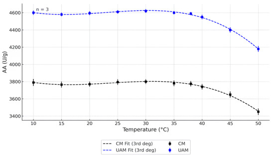 Effect of temperature on AA (pH = 6.0) obtained by the CM and UAM. Mean values ± SD (n = 3). CM Fit and UAM Fit represent third-degree polynomial fits.