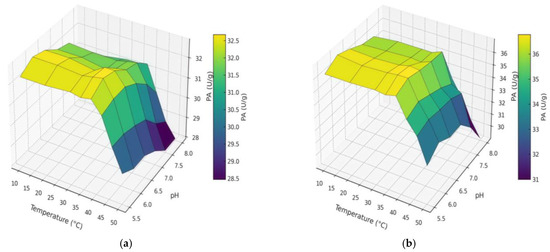 The 3D surface plots (Figure 4) illustrate the dependence of EA on temperature and pH for pancreatin samples obtained using the CM and UAM.