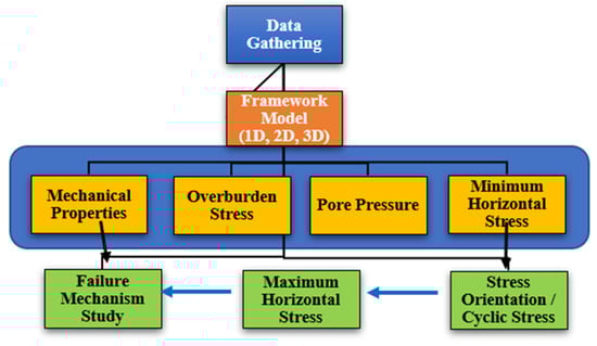 The geomechanical factors that primarily influence subsurface hydrogen storage include injection and production rates, wellbore shape, rock tensile strength, and the presence of fractures or faults [15]. Geomechanical modeling examines the impacts of geomechanics, such as the potential for reservoir fractures, the stability of wellbores and cap rocks, and the reactivation of faults. The ongoing processes of gas input and withdrawal in hydrogen storage affect the effective stress due to variations in pore pressure, thereby jeopardizing the integrity of both the reservoir and the caprock. When hydrogen is repeatedly supplied and withdrawn, the pressure inside the reservoir varies. These pressure shifts might cause existing fissures or weak places in the rock to reopen, increasing the risk of leaks and gas loss [4]. To determine how effectively a reservoir can manage this, consider how the rock reacts to stress. That includes understanding its strength, how far it can bend without breaking, and how it responds to various stresses. This type of knowledge is critical for ensuring the storage site’s stability and safety throughout hydrogen activities. Figure 4, ref. [16] illustration explaining the basics of geomechanical studies.