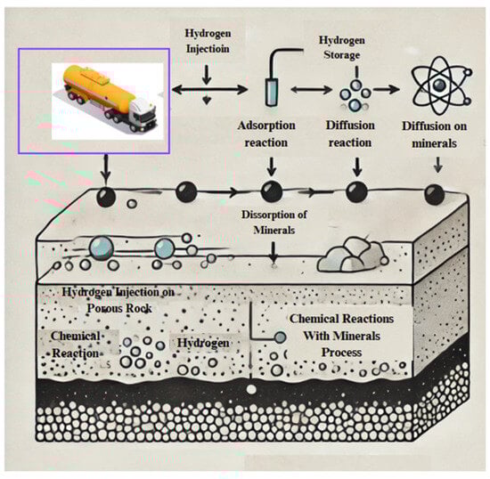 Hydrogen’s reactivity can produce dangerous gases that can compromise the wellbore, soil, and atmosphere. Geochemical interactions among reservoir fluids, cushion gas, hydrogen gas, and reservoir minerals may occur during UHS. Employing conversion into hydrogen sulfide (H2S) and methane (CH4), the processes cause hydrogen to be depleted. The geochemical reactions taking on in UHS might cause minerals to dissolve or precipitate, hence altering permeability and porosity. This modification could cause structural collapse or defects in the integrity of the cap rock [13]. Geochemical processes include both biotic and abiotic interactions among a spectrum of reactions. The abiotic processes especially entail the interaction of non-living molecules such as hydrogen [24], oil, gas, brine, rock minerals, and so on. Figure 5 depicts interactions between hydrogen and geological minerals.